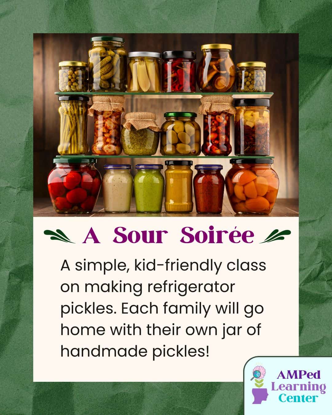 Join Anne Marie Palazzolo for a class on making refrigerator pickles from a wide variety of different veggies. Each child-guardian pair or group will go home with their very own jar of handmade pickles.