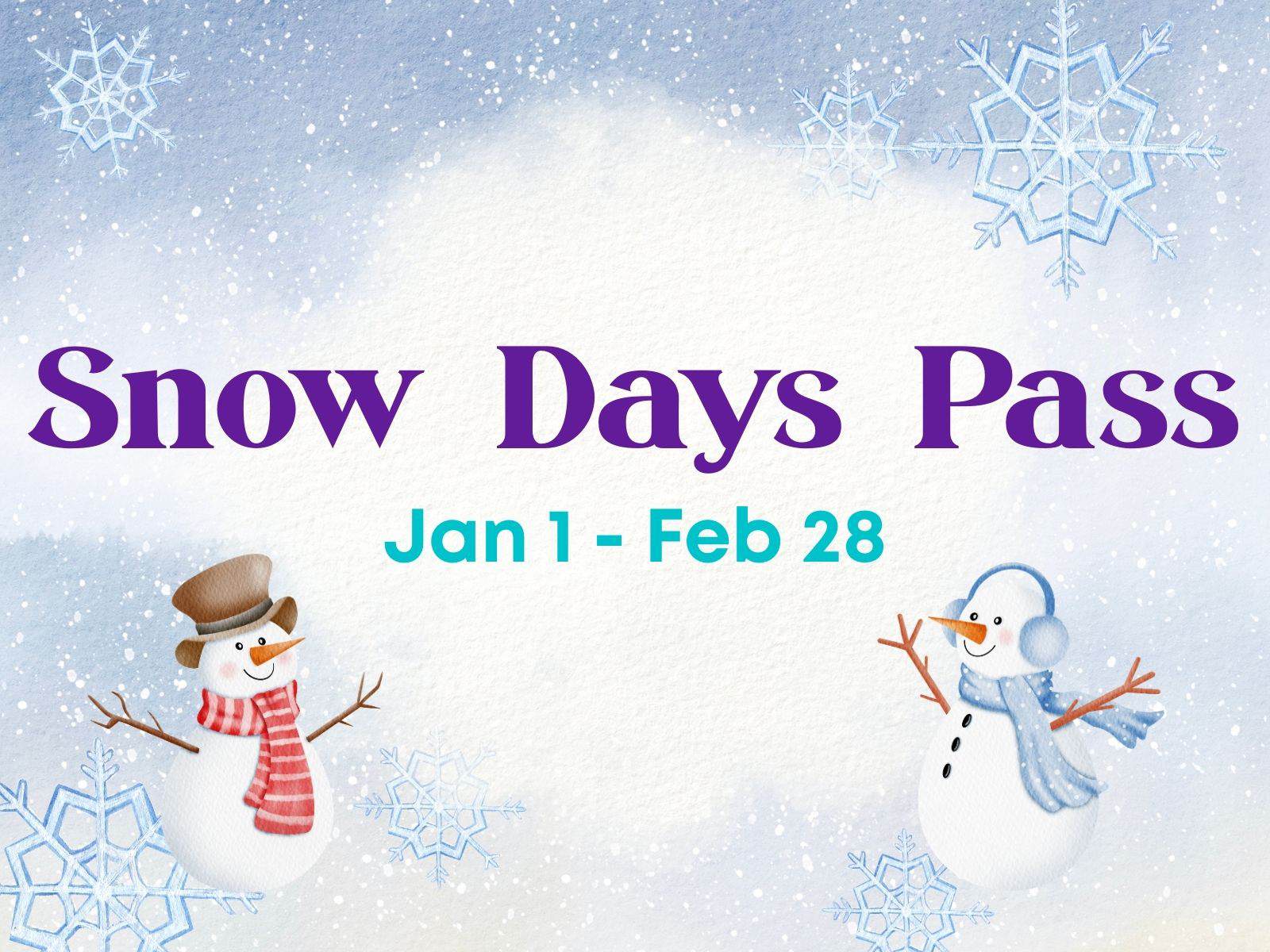 The Snow Days Pass provides unlimited open play for one child from January 1 through February 28. This pass is ideal for families looking to stay active after the holidays and enjoy plenty of indoor playtime during the coldest stretch of winter.