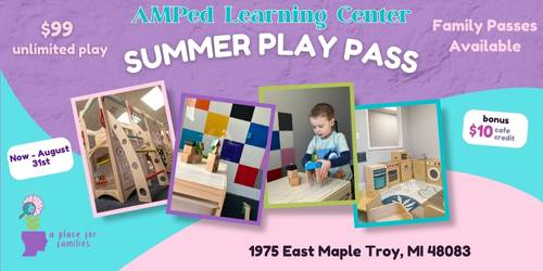 Sign up for the summer play pass for just $99 for one child, $165 for two children, or $209 for 3+ children. Enjoy unlimited open play at AMPed Learning Center through August 31st, plus get a bonus $10 cafe credit!